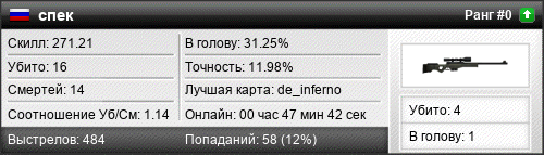 | de_inferno | 15 | 1.36 | 0.54 | 1 | 20 | 00:27:52 | 24.03.2019 | |