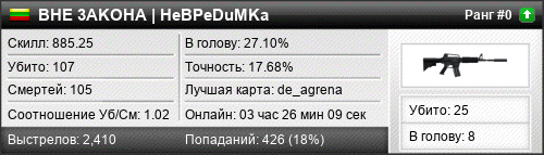 | 03.08.2019 @ 21:52 - 21:57 | de_contra | 00:04:55 | 1 | 3 | 1 | 100.00% | 18.18% | 885.25 |