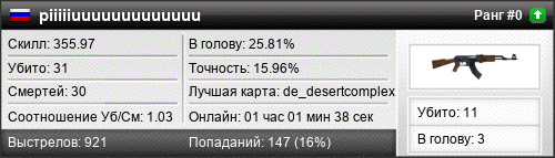 | de_desertcomplex | 13 | 2.17 | 0.85 | 1 | 9 | 00:15:23 | 22.12.2015 | |