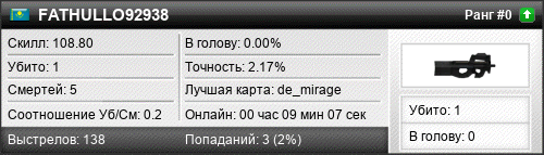 | 04.05.2019 @ 06:33 - 06:36 | de_mirage | 00:03:18 | 1 | 2 | 0 | 0.00% | 1.43% | 109.32 |