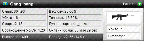 | 17.06.2022 @ 23:08 - 23:21 | de_cobblestone | 00:12:35 | 1 | 1 | 0 | 0.00% | 12.00% | 304.96 |