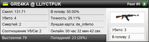 | de_inferno | 4 | 2.00 | 0.53 | 1 | 4 | 00:07:33 | 26.04.2019 | |