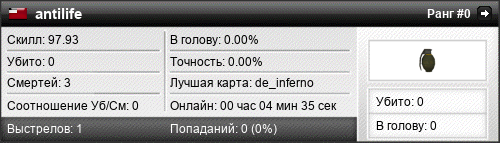 | de_inferno | 0 | 0.00 | 0.00 | 1 | 2 | 00:02:32 | 19.05.2019 | |