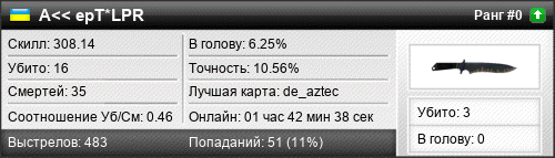 | de_aztec | 7 | 0.88 | 0.30 | 3 | 16 | 00:23:32 | 10.07.2019 | |