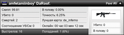 de_inferno | 0 | 0.00 | 0.00 | 1 | 3 | 00:03:12 | 06.05.2019 |