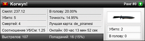 | de_inferno | 0 | 0.00 | 0.00 | 1 | 3 | 00:05:17 | 08.05.2019 | |