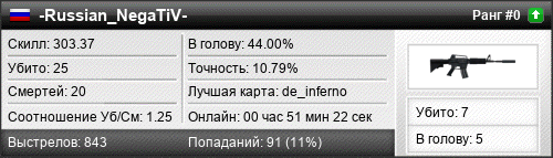 | de_inferno | 10 | 5.00 | 1.13 | 3 | 7 | 00:08:53 | 23.12.2015 | |