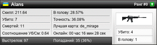 | de_mirage | 4 | 0.80 | 0.57 | 1 | 6 | 00:07:01 | 20.05.2019 | |