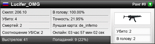 | de_inferno | 4 | 2.00 | 0.78 | 1 | 3 | 00:05:07 | 03.06.2019 | |