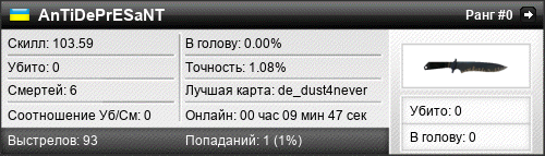 | 15.06.2019 @ 08:20 - 08:23 | de_prodigy | 00:02:59 | 0 | 3 | 0 | 0.00% | 2.13% | 101.61 |
