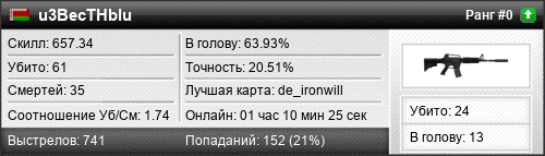 | de_ironwill | 22 | 2.44 | 1.12 | 1 | 11 | 00:19:34 | 14.06.2019 | |