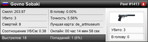 | 06.07.2019 @ 22:38 - 22:46 | de_artmuseum | 00:07:31 | 3 | 3 | 0 | 0.00% | 0.00% | 204.42 |