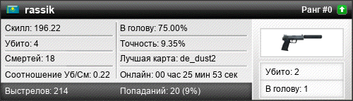 | de_dust2 | 2 | 0.20 | 0.13 | 7 | 11 | 00:15:23 | 21.04.2020 | |