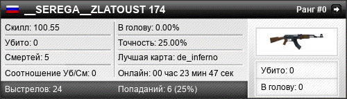 | de_aztec | 0 | 0.00 | 0.00 | 4 | 1 | 00:01:26 | 14.02.2020 | |