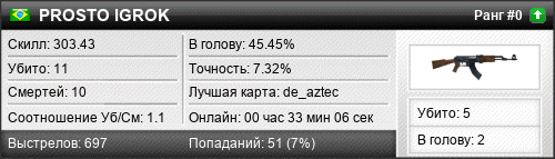 | 10.05.2018 @ 03:25 - 03:46 | de_aztec | 00:21:18 | 11 | 9 | 5 | 45.45% | 7.26% | 303.43 |