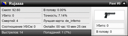 | de_inferno | 0 | 0.00 | 0.00 | 1 | 5 | 00:07:23 | 20.09.2019 | |