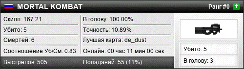 | 01.08.2022 @ 08:15 - 08:17 | de_kabul | 00:02:13 | 0 | 0 | 0 | 0.00% | 0.00% | 167.21 |