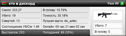 | de_aztec | 19 | 1.58 | 0.94 | 1 | 14 | 00:20:18 | 29.09.2019 | |