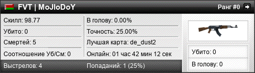 | de_dust2 | 0 | 0.00 | 0.00 | 1 | 16 | 00:23:05 | 11.10.2019 | |