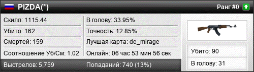 | de_mirage | 35 | 1.75 | 0.59 | 2 | 36 | 00:59:30 | 17.10.2019 | |