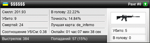 | 09.11.2016 @ 09:45 - 09:57 | de_dust2 | 00:11:22 | 3 | 7 | 1 | 33.33% | 12.94% | 160.37 |