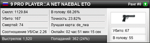 | 20.11.2019 @ 14:20 - 15:06 | de_lite | 00:45:50 | 40 | 16 | 27 | 67.50% | 29.59% | 1068.26 |