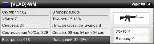 de_dust2 | 2 | 0.40 | 0.19 | 1 | 7 | 00:10:21 | 22.10.2015 |