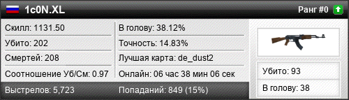 | de_dust2 | 23 | 1.92 | 0.94 | 1 | 15 | 00:24:23 | 16.01.2020 | |