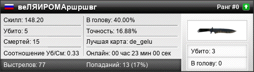 | 07.12.2019 @ 18:16 - 18:30 | de_gelu | 00:13:45 | 4 | 6 | 1 | 25.00% | 10.87% | 154.01 |