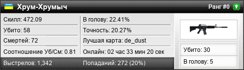 | de_dust2 | 4 | 0.57 | 0.40 | 1 | 13 | 00:09:57 | 18.12.2019 | |