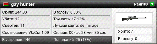 | 21.12.2019 @ 20:33 - 20:44 | de_mirage | 00:11:07 | 6 | 2 | 1 | 16.67% | 20.34% | 245.09 |