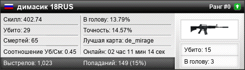 | de_mirage | 8 | 1.14 | 0.26 | 3 | 25 | 00:30:37 | 20.02.2020 | |