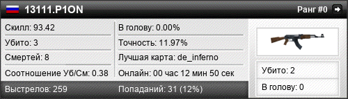 | de_inferno | 2 | 1.00 | 0.42 | 2 | 4 | 00:04:49 | 24.10.2015 | |