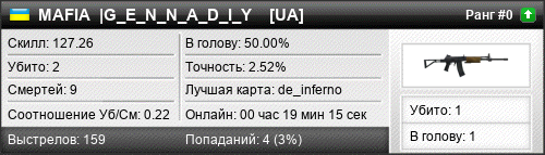 | de_inferno | 2 | 0.40 | 0.15 | 1 | 9 | 00:13:10 | 26.01.2020 | |