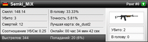 | 26.01.2020 @ 17:37 - 17:52 | de_dust2 | 00:14:32 | 2 | 9 | 0 | 0.00% | 4.39% | 128.21 |