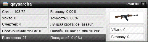| de_assault | 0 | 0.00 | 0.00 | 0 | 1 | 00:01:26 | 01.01.1970 | |