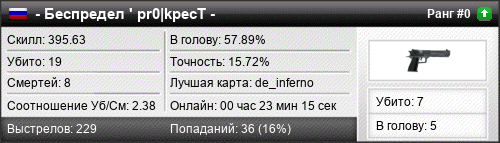 | 24.06.2021 @ 13:14 - 13:16 | de_dust | 00:02:07 | 0 | 1 | 0 | 0.00% | 0.00% | 290.01 |