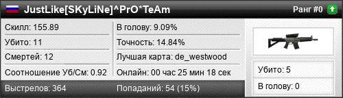| de_westwood | 10 | 1.11 | 0.54 | 1 | 13 | 00:18:37 | 06.02.2020 | |