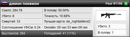 | de_nightdefend2 | 3 | 0.27 | 0.18 | 1 | 11 | 00:16:44 | 29.11.2025 | |