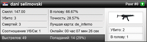 | de_inferno | 2 | 2.00 | 0.92 | 1 | 2 | 00:02:11 | 20.02.2020 | |