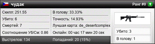 | 18.11.2020 @ 10:29 - 10:44 | de_desertcomplex | 00:15:01 | 6 | 6 | 2 | 33.33% | 17.86% | 251.55 |