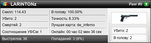 | de_inferno | 2 | 2.00 | 1.58 | 1 | 1 | 00:01:16 | 01.01.2016 | |