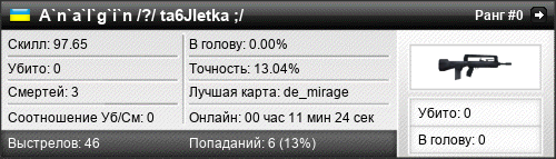 | 15.03.2020 @ 10:13 - 10:19 | de_mirage | 00:06:06 | 0 | 0 | 0 | 0.00% | 0.00% | 97.65 |