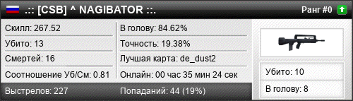 | 08.11.2020 @ 16:01 - 16:18 | de_kgb | 00:16:31 | 10 | 6 | 8 | 80.00% | 26.42% | 267.52 |