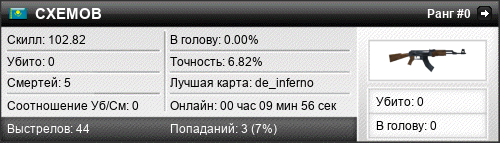 | de_inferno | 0 | 0.00 | 0.00 | 1 | 3 | 00:05:41 | 14.03.2020 | |