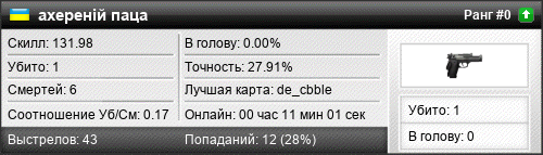 | 17.03.2020 @ 19:12 - 19:17 | de_cbble | 00:04:30 | 1 | 3 | 0 | 0.00% | 36.84% | 128.60 |