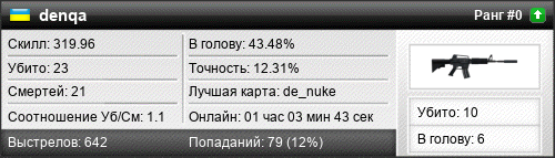 | de_inferno | 6 | 1.20 | 0.48 | 1 | 10 | 00:12:31 | 08.04.2020 | |