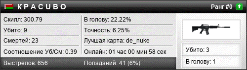 | 03.07.2023 @ 12:33 - 12:59 | de_nuke | 00:26:24 | 6 | 16 | 1 | 16.67% | 6.15% | 268.68 |