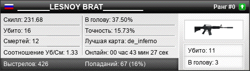 | de_inferno | 9 | 3.00 | 0.58 | 2 | 11 | 00:15:39 | 20.04.2020 | |
