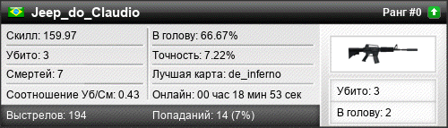 | de_inferno | 3 | 1.00 | 0.24 | 2 | 9 | 00:12:31 | 18.04.2020 | |
